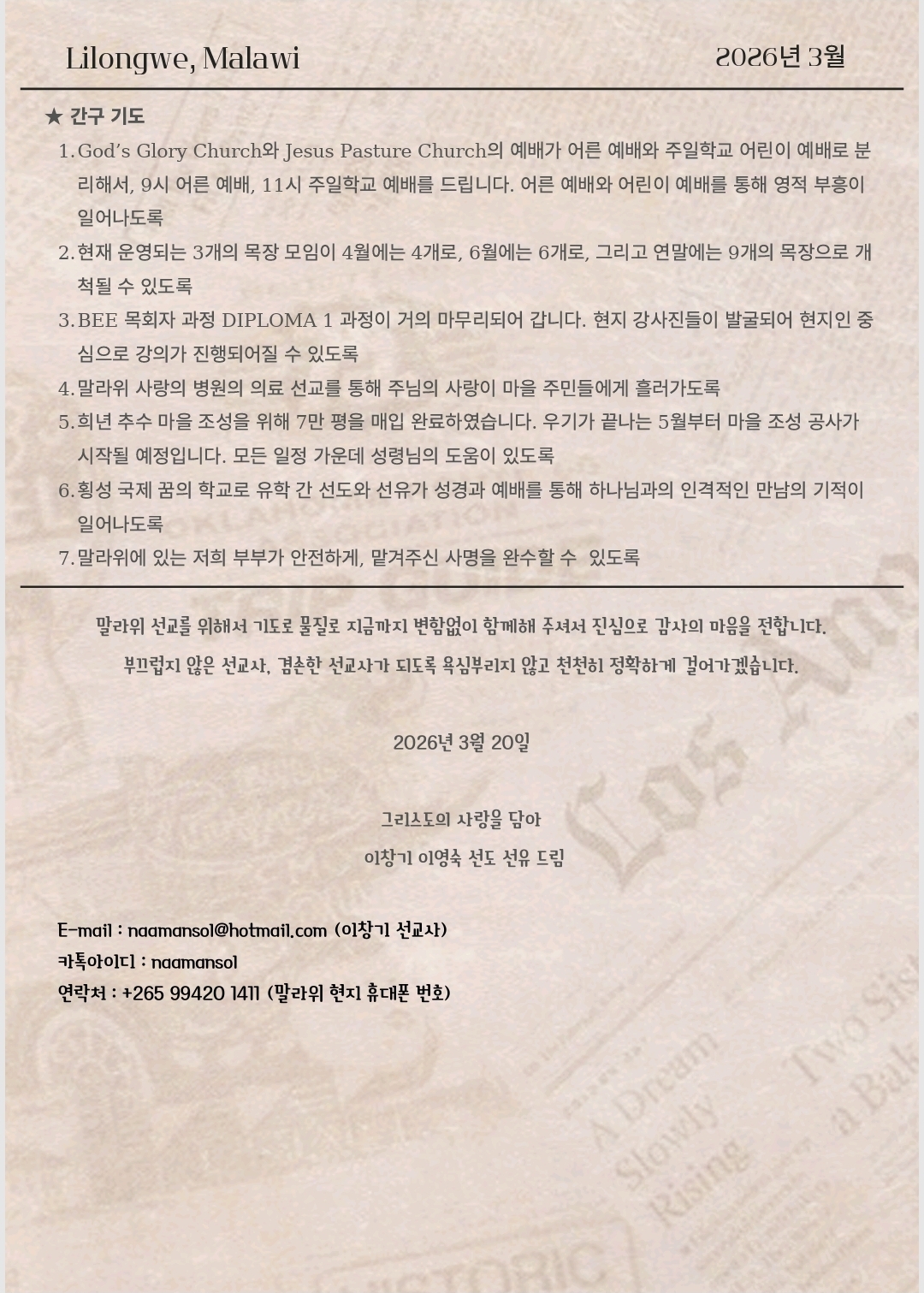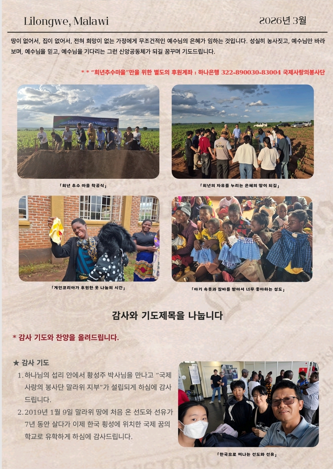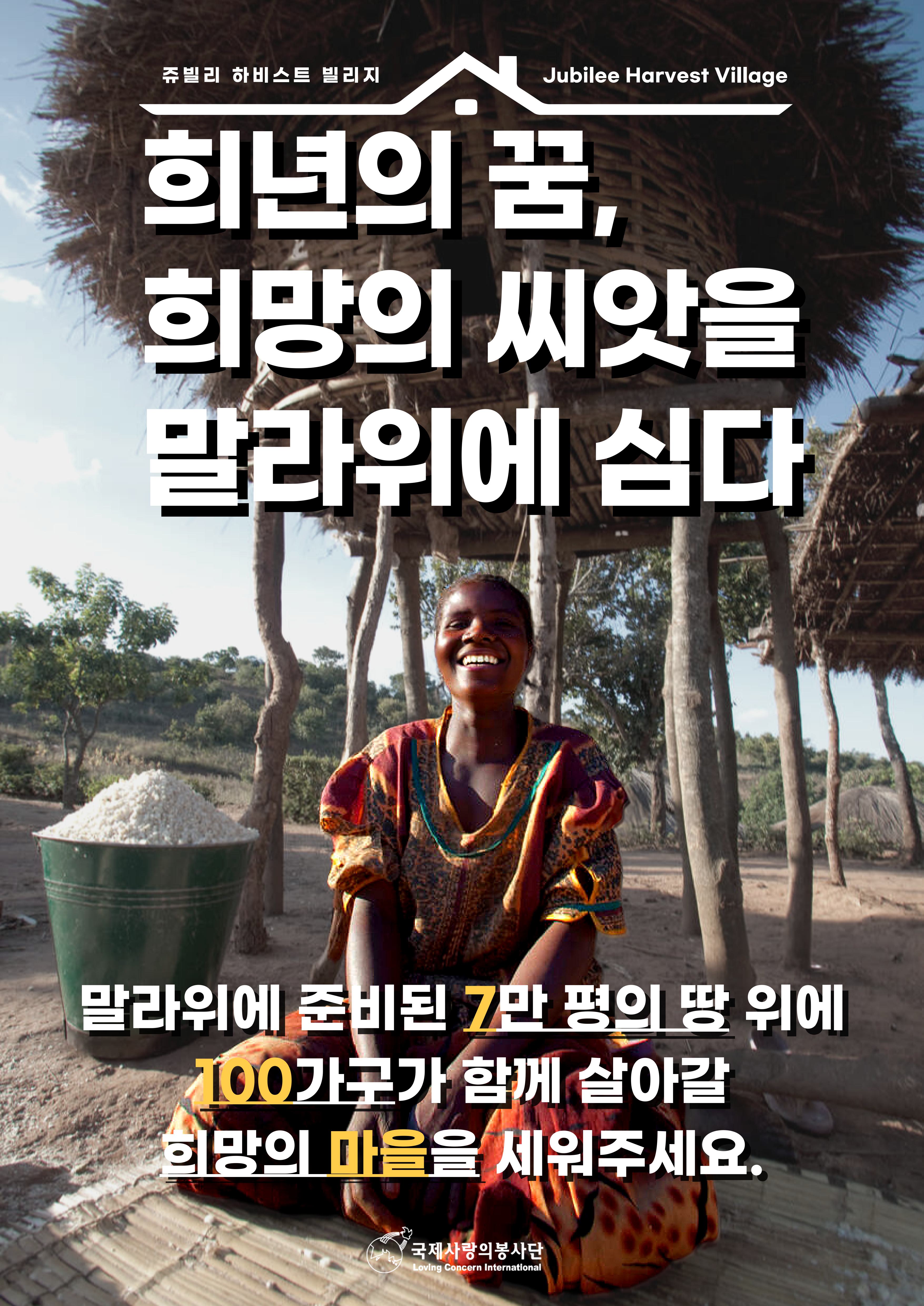 말라위 릴롱궤에 준비된 7만 평의 땅 위에, 100 가구가 함께 살아갈 '희년 추수 마을(Jubilee Harvest Village)'을 세웁니다. 70년 전 전쟁의 폐허 속에서 세계 여러 나라의 도움으로 다시 일어섰던 대한민국처럼, 이제 우리가 말라위의 손을 잡아줄 차례입니다.